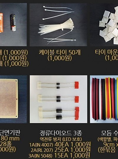 LED튜닝용품 건전지,케이블타이,타이마운트,PCB페놀단면기판,정류다이오드,모듬수축튜브,스위치,가변전압모듈